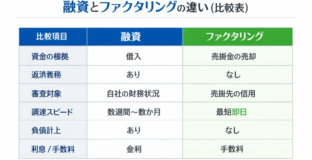 ◆融資とファクタリングの違い(比較表)